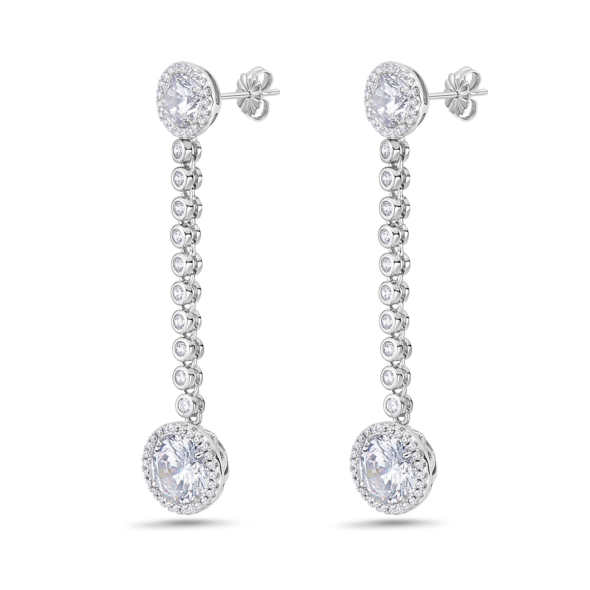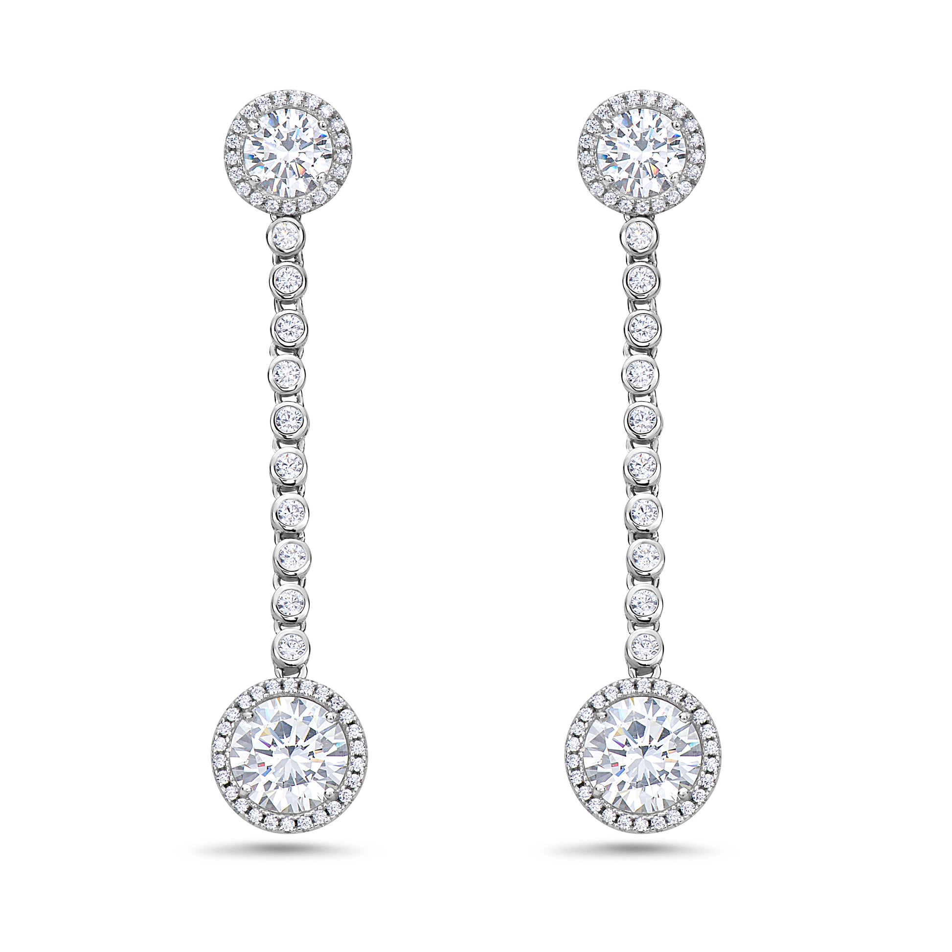 Sterling Silver hanging double halo, Bezel set earrings with Cubic Zirconia,